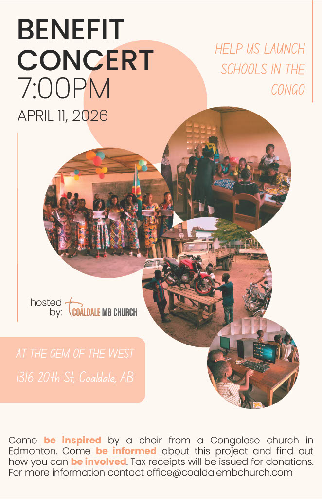 To raise money to launch these schools, we will be hosting a Benefit Concert on April 11, 2026, at the Gem of the West Museum in Coaldale. We have invited the Choir from the Goshen Community Church in Edmonton (a Congolese church in our conference) to perform.