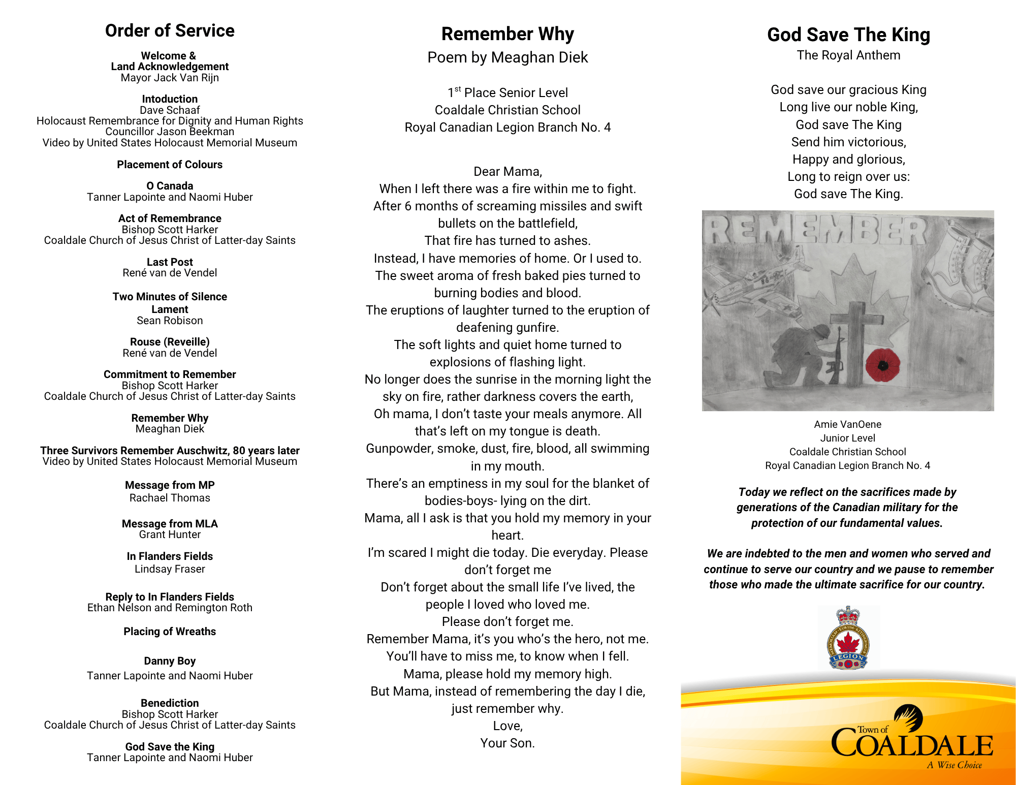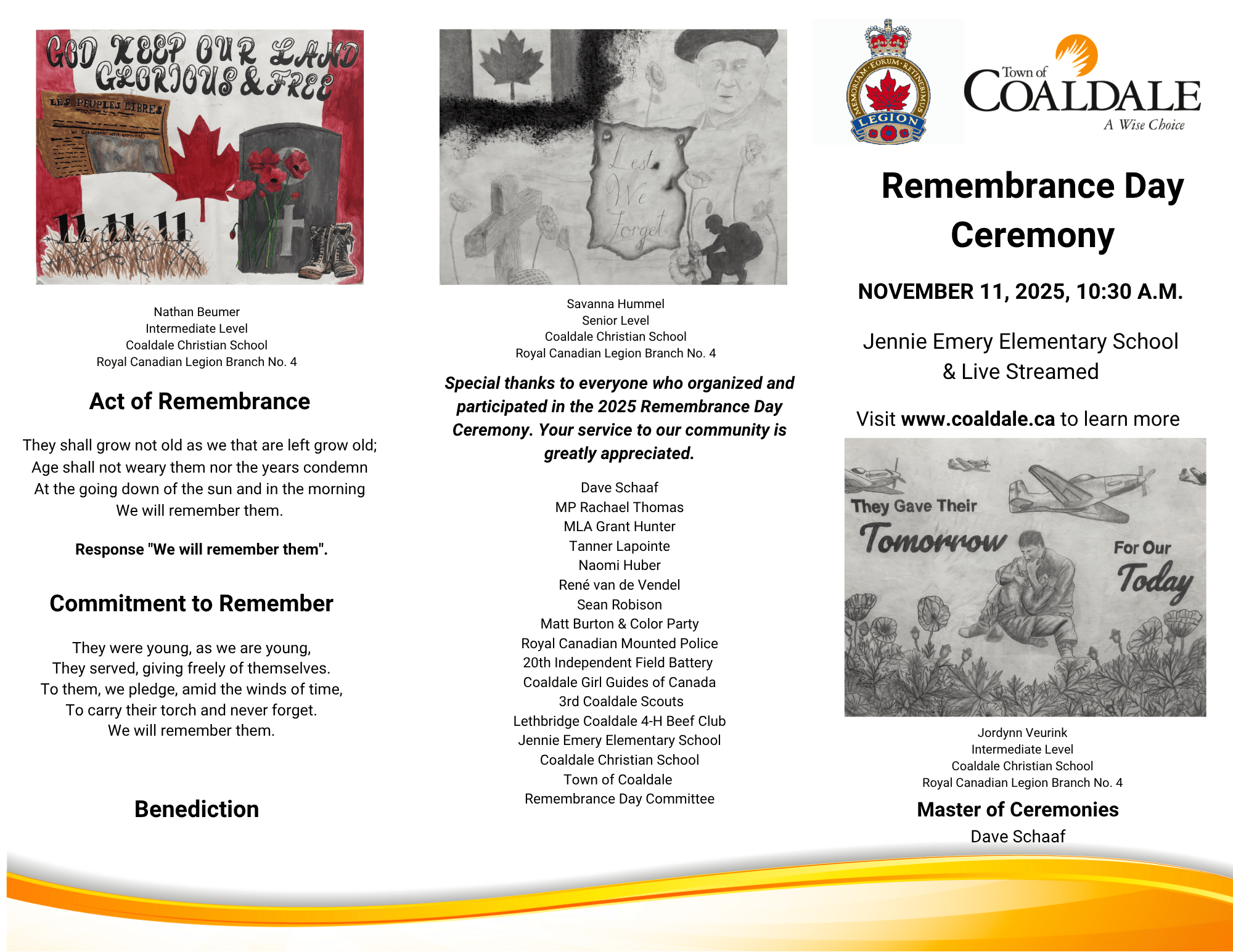 The Town of Coaldale will host an in-person Remembrance Day Ceremony that will also be presented virtually via live stream on our YouTube Channel. The Ceremony will begin at 10:30 AM on November 11. The in-person ceremony will be at Jennie Emery Elementary School.